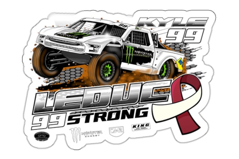 LeDuc’s team shop is selling 99 Strong merchandise to support his treatment. The logo for his effort displays his Pro 4 truck and the burgundy/white ribbon for head and neck cancer awareness.