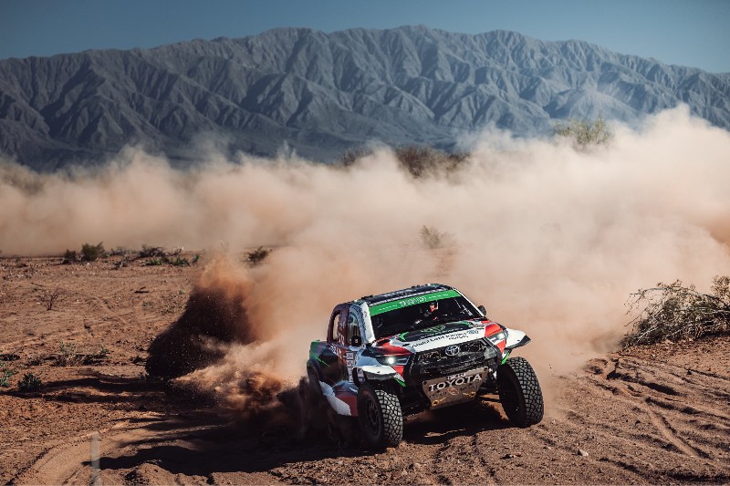 After finishing second to Nasser Al-Attiyah in Sunday’s Prologue, Al-Rajhi took the lead after sixty kilometres. Although he built an advantage over his fellow Hilux, the script flipped on him with a pair of tyre failures that enabled Al-Attiyah to win the stage by a minute and six seconds.