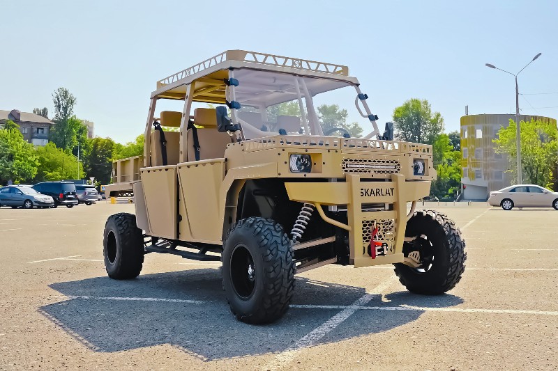 SKARLAT is a Ukrainian UTV brand with a base in the United Arab Emirates, where Pritulyak resides; he is also a spokesman for the marque. Their centrepiece Raptor 1000 is a rebadged Massimo Warrior 1000 MXD Crew, sporting a four-stroke V-twin engine capable of 80 horsepower. Measuring at roughly 154.5 inches (392.43 cm) long by 74.8 in (190 cm) wide and weighing at 2,530 pounds when dry (1,147.59 kg), the four-seater can tow 1,763 pounds (800 kg) which makes it capable of rapid cargo transport and evacuating wounded personnel from battle. A racing-spec version called the XTRM underwent three weeks of testing in desert environments led by in May. He hopes to unveil the SKARLAT at the Rally TT Cuenca and raise interest from outside investors.